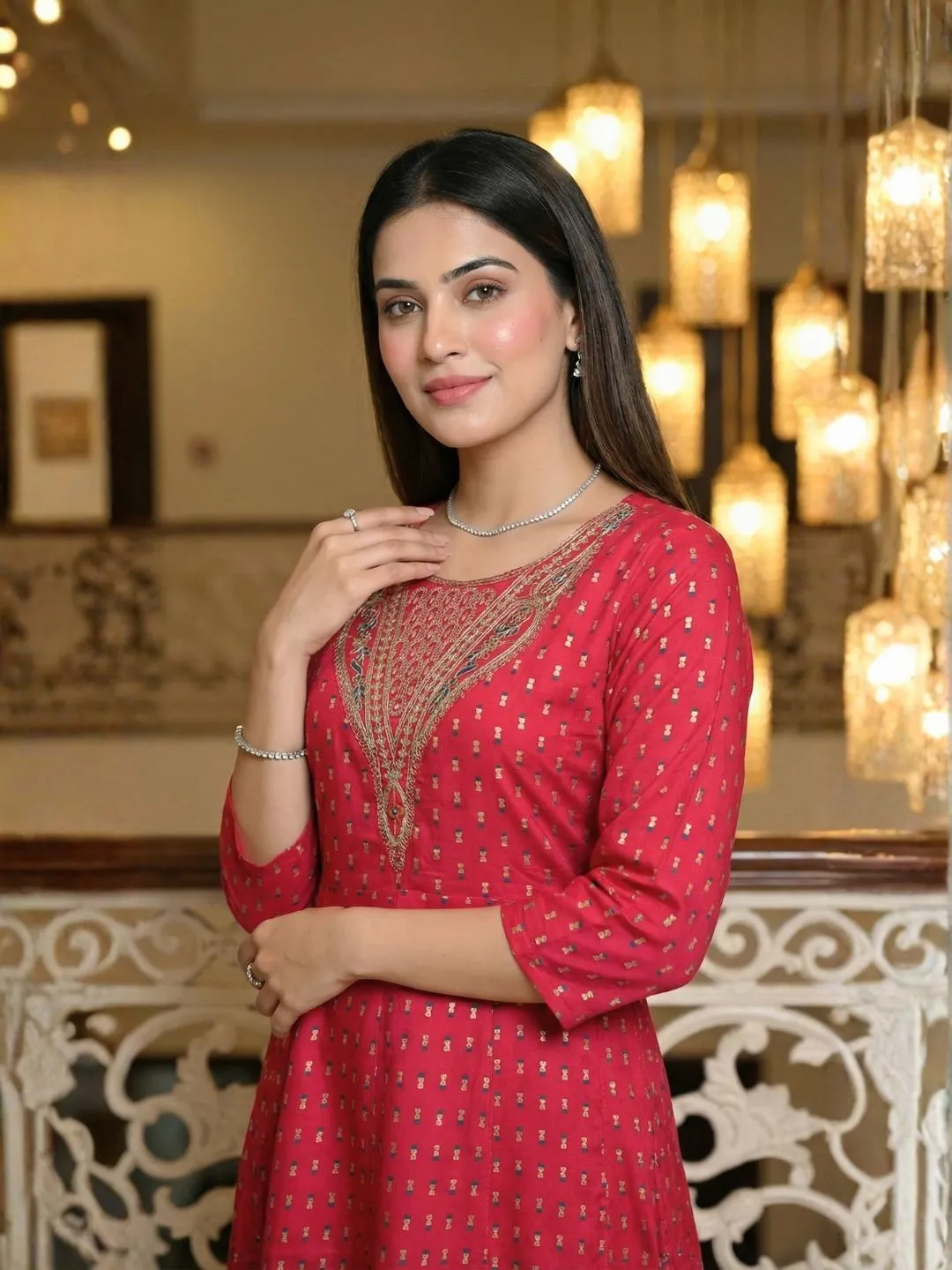 Sleeve Detail: The 3/4th sleeves are finished with a delicate border, keeping the look cohesive and polished.