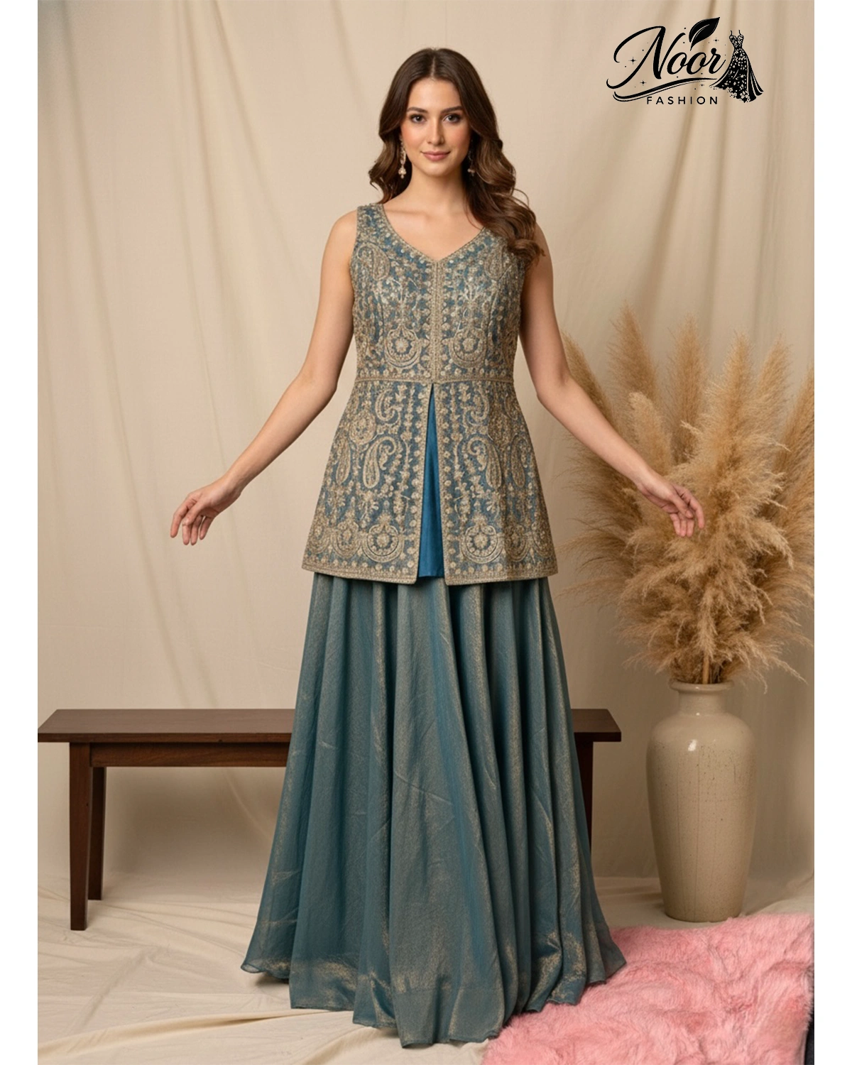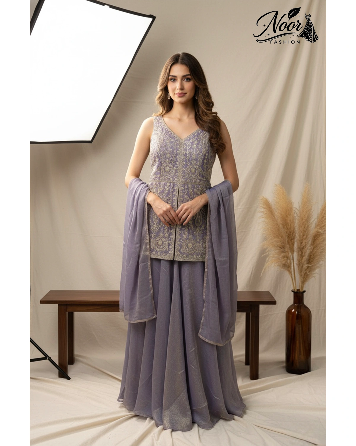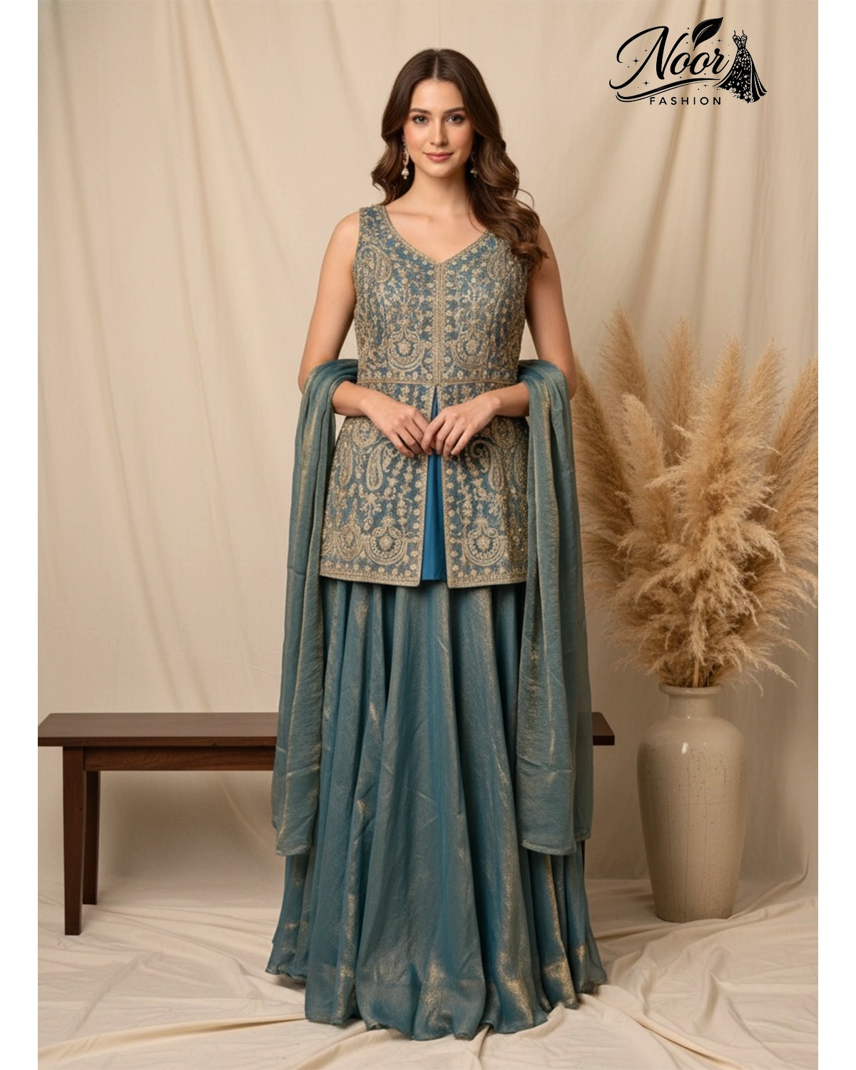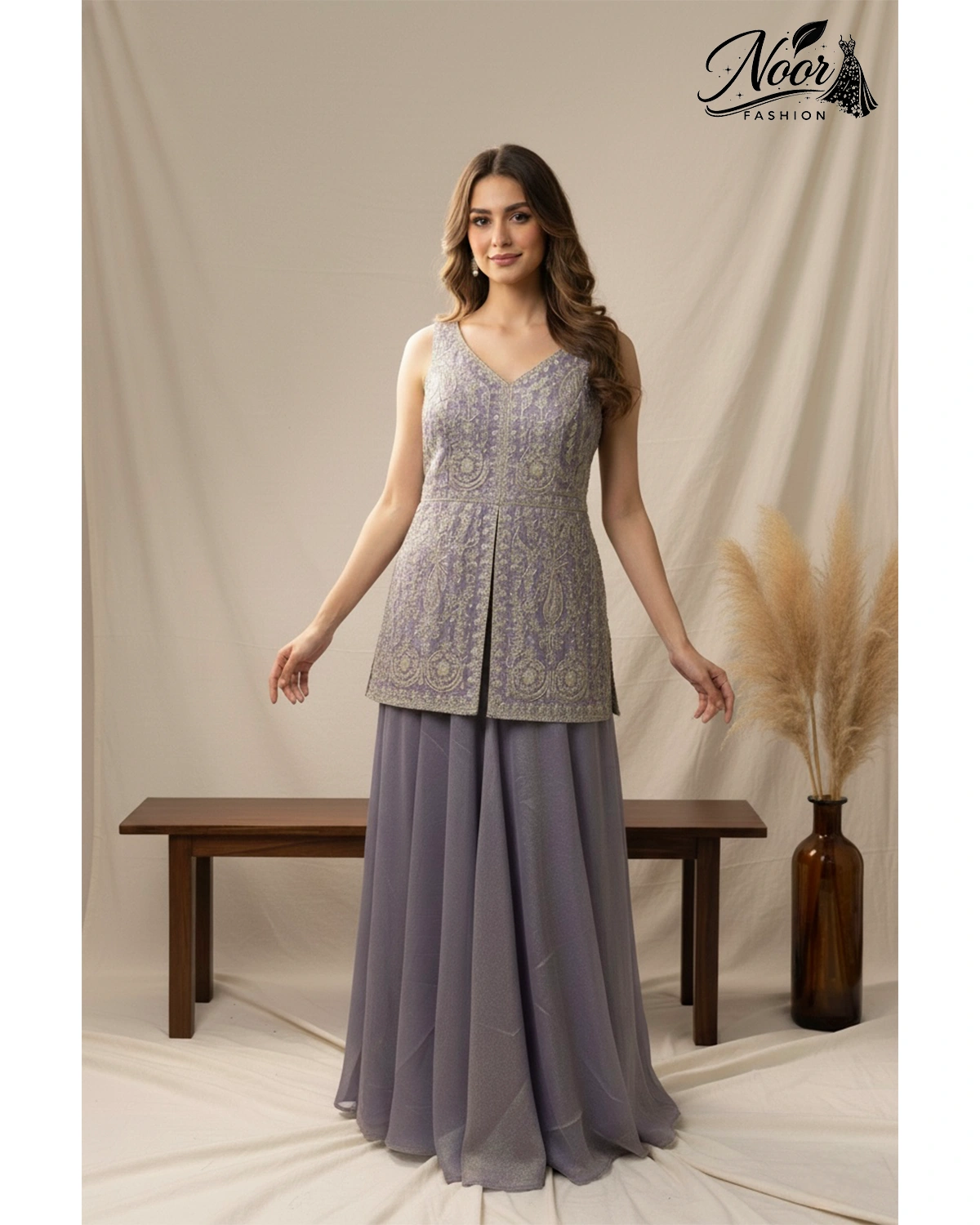 Experience the pinnacle of ethnic luxury with our Jimmy Choo Hand-Touch Zari Work Sharara Set. Exclusively curated by Noor Fashion Nepal, this ensemble is designed for the woman who seeks a majestic presence at high-profile weddings, receptions, and grand festive celebrations. Available in two sophisticated shades—deep Teal Blue and soft Purple (Mauve)—this set combines the trendsetting shimmer of Jimmy Choo fabric with the timeless beauty of hand-worked gold zari.