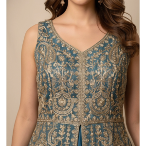 Top: Sleeveless V-neck tunic with heavy Hand-Touch Gold Zari Work and a stylish front slit.