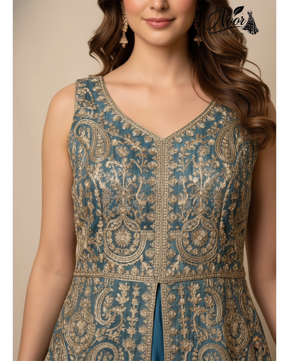 For the Teal Blue set, pair with heavy gold Kundan or temple jewelry. For the Purple set, opt for silver-toned or diamond jewelry to complement the cooler tones. Style your hair in soft, cascading waves and finish with high-heeled sandals to accentuate the dramatic flare of the sharara.