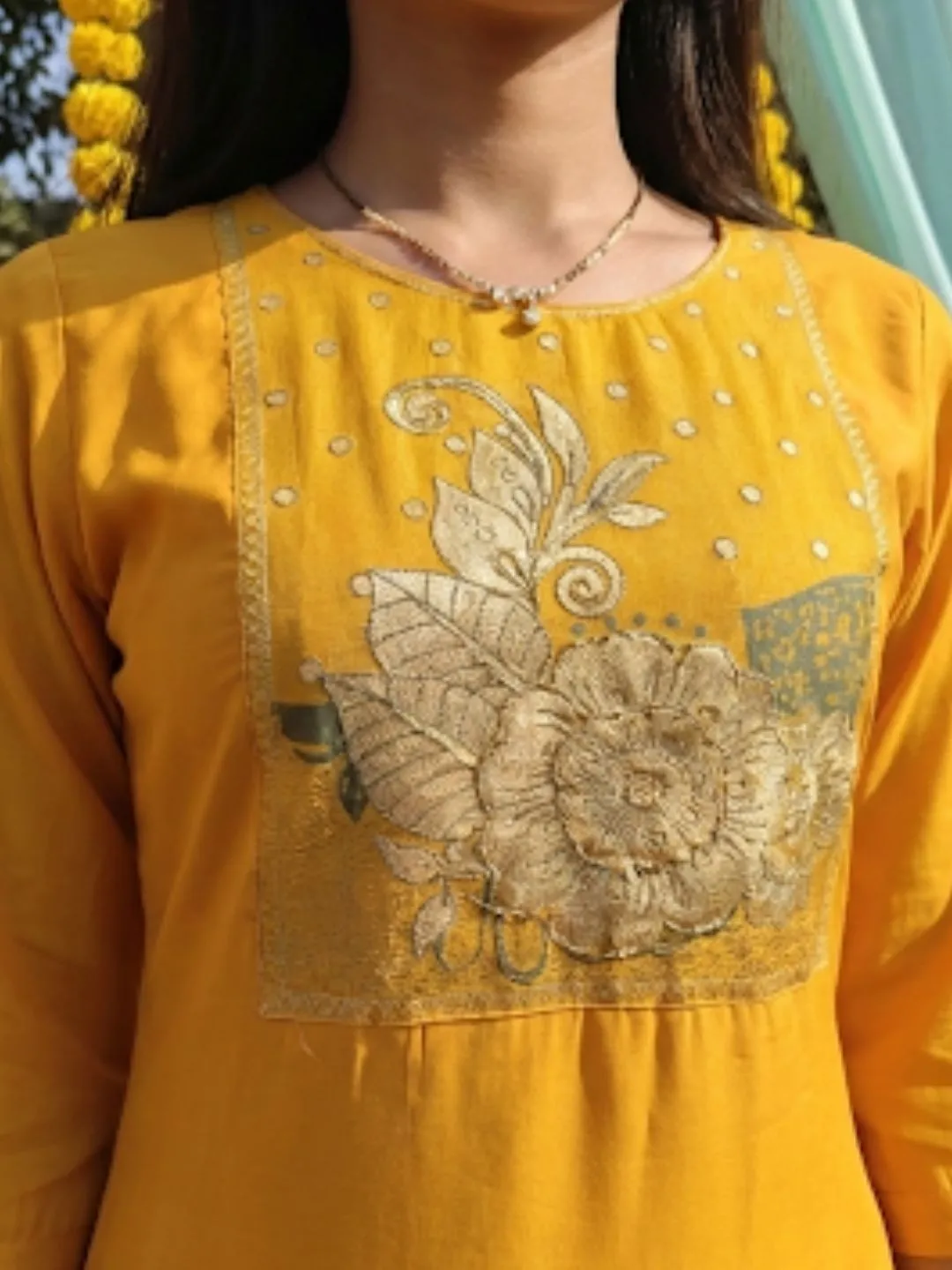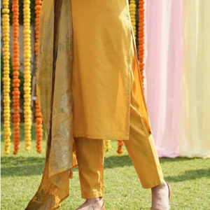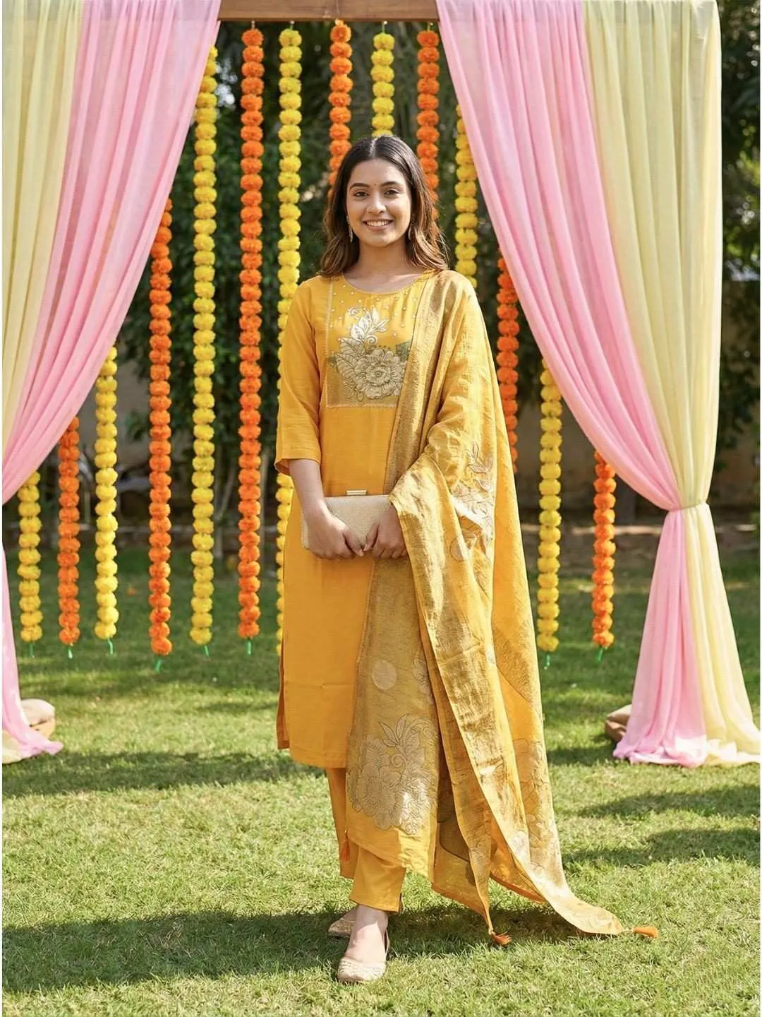 Step into the spotlight and embrace the radiance of the golden hour.The Solar Glow Silk Suit (SKU: NF767195) is more than just an outfit; it is a celebration of joy, festivity, and timeless tradition. Designed for the woman who loves to stand out with grace, this ensemble captures the essence of luxury with its vibrant Mustard Gold hue. Whether you are attending a sun-kissed Haldi ceremony or an opulent evening reception, this suit ensures you remain the center of attention.