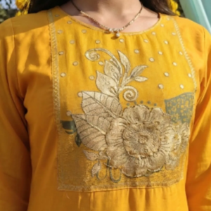Refined Silhouette: The kurta features a classic round neckline and 3/4th sleeves, offering a modest yet chic appeal. The straight-cut pants provide a balanced, contemporary finish to the heavy top and dupatta.