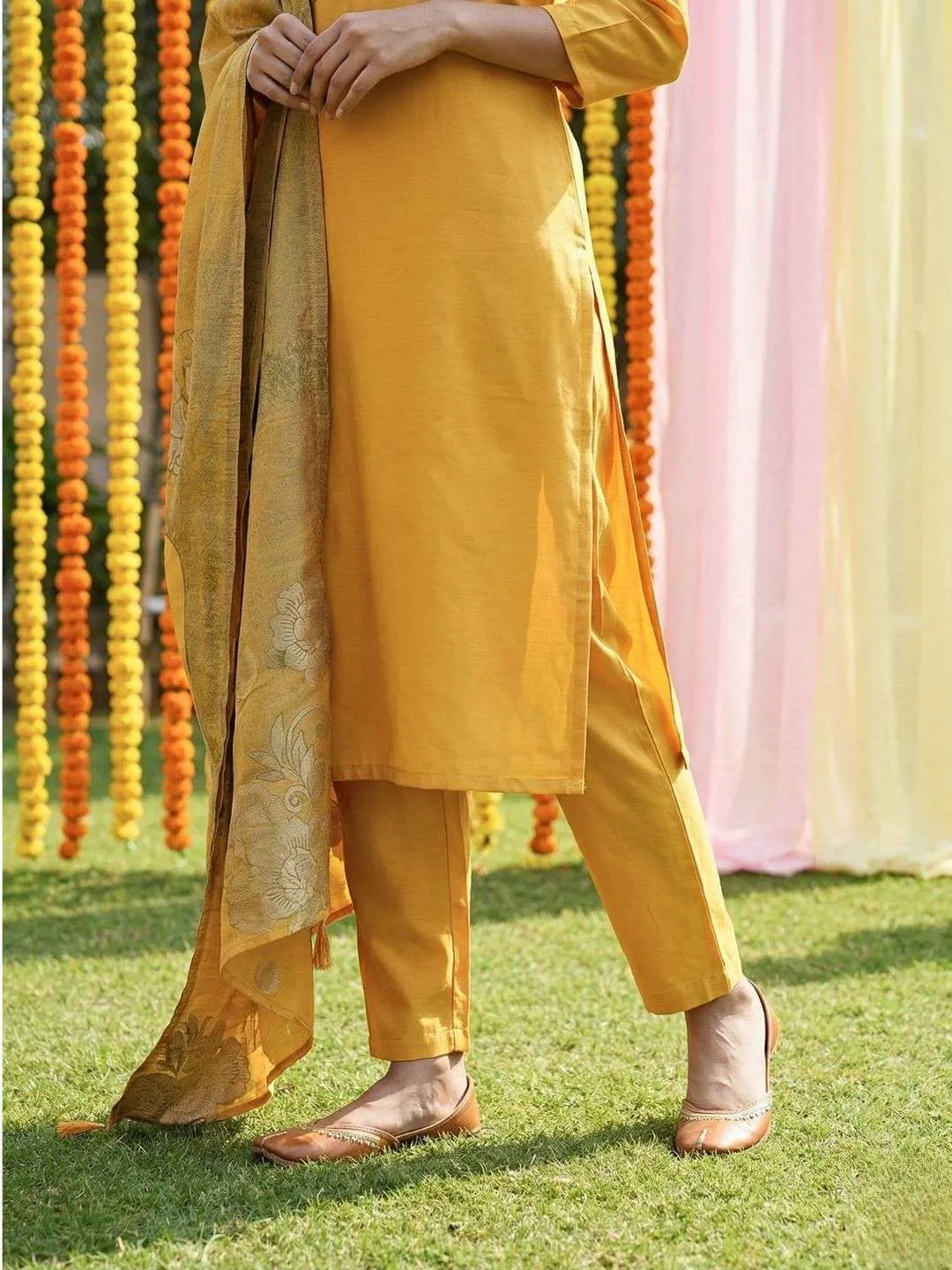 Shine bright in the Solar Glow Silk Suit. This premium mustard 3-piece set features exquisite gold embroidery and a designer dupatta. Shop the festive look now!