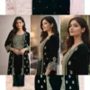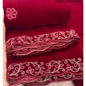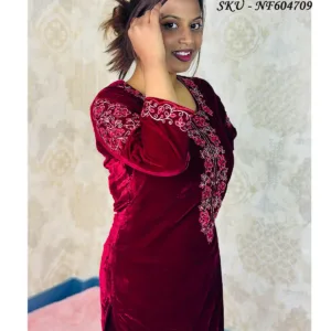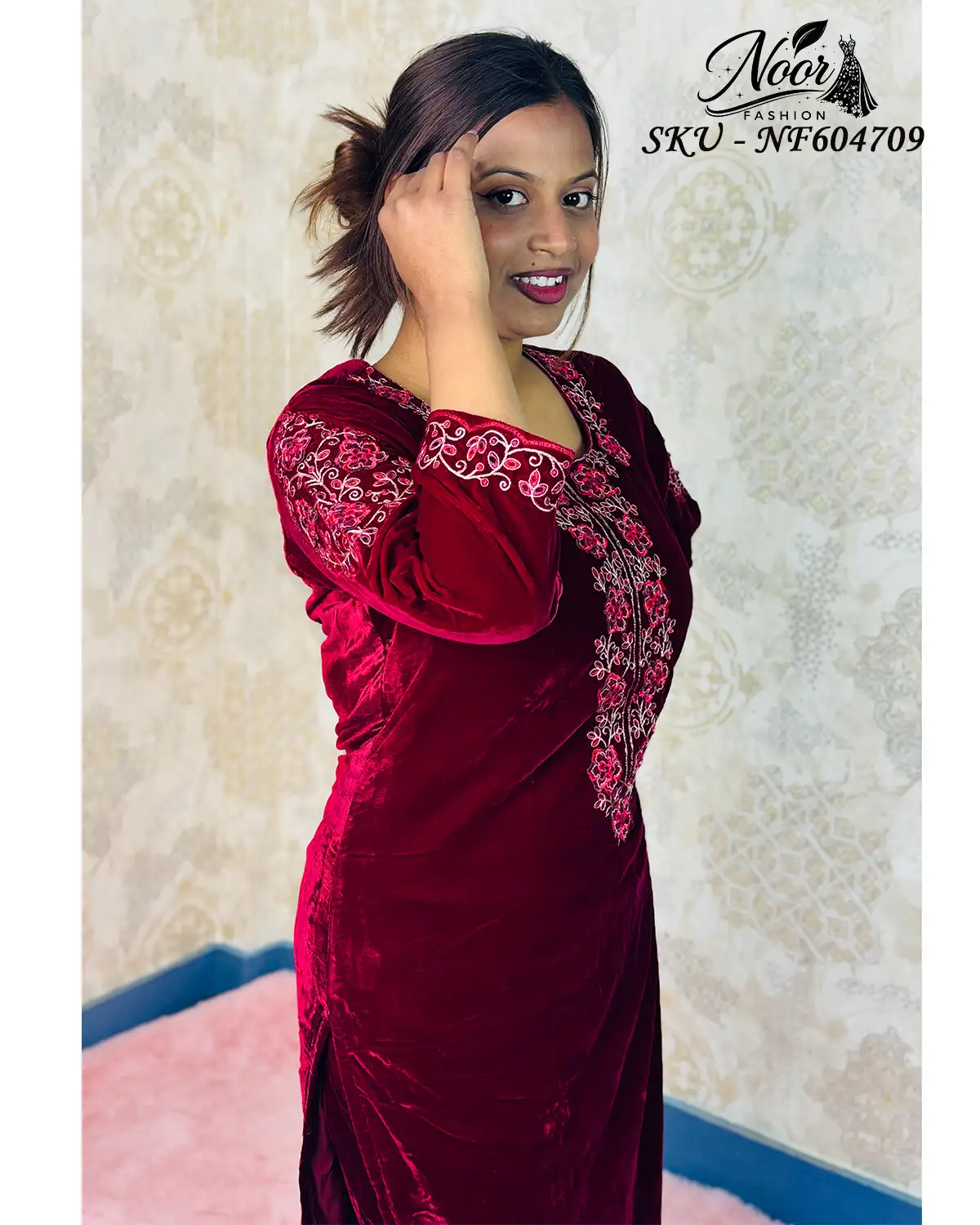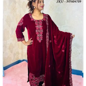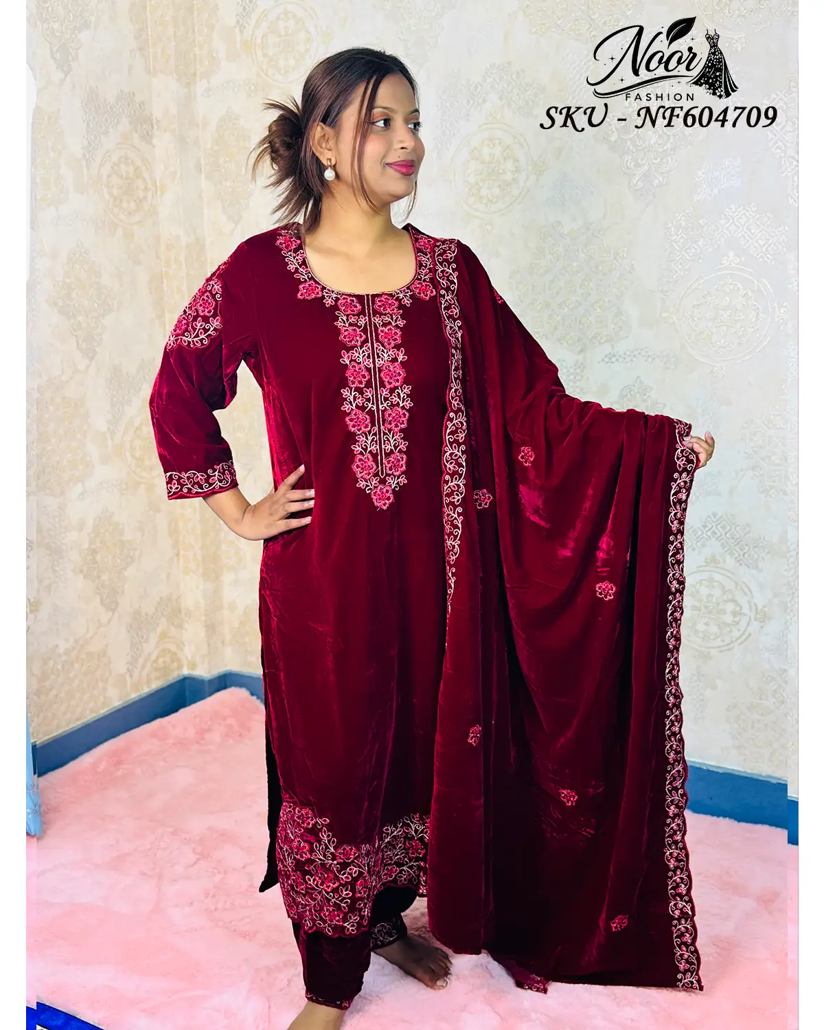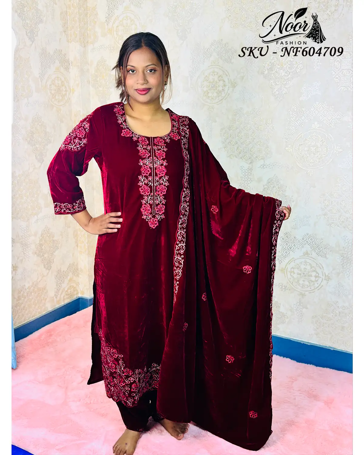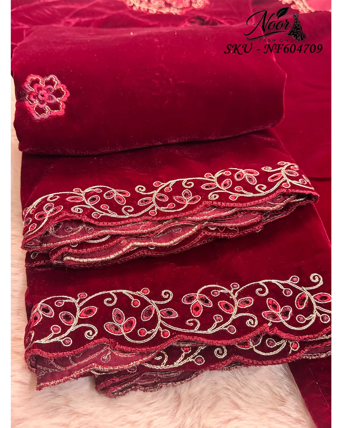 Luxurious maroon velvet 3-piece suit designed for formal warmth and elegance, featuring rich zari, sequin, and aari embroidery with a majestic look.