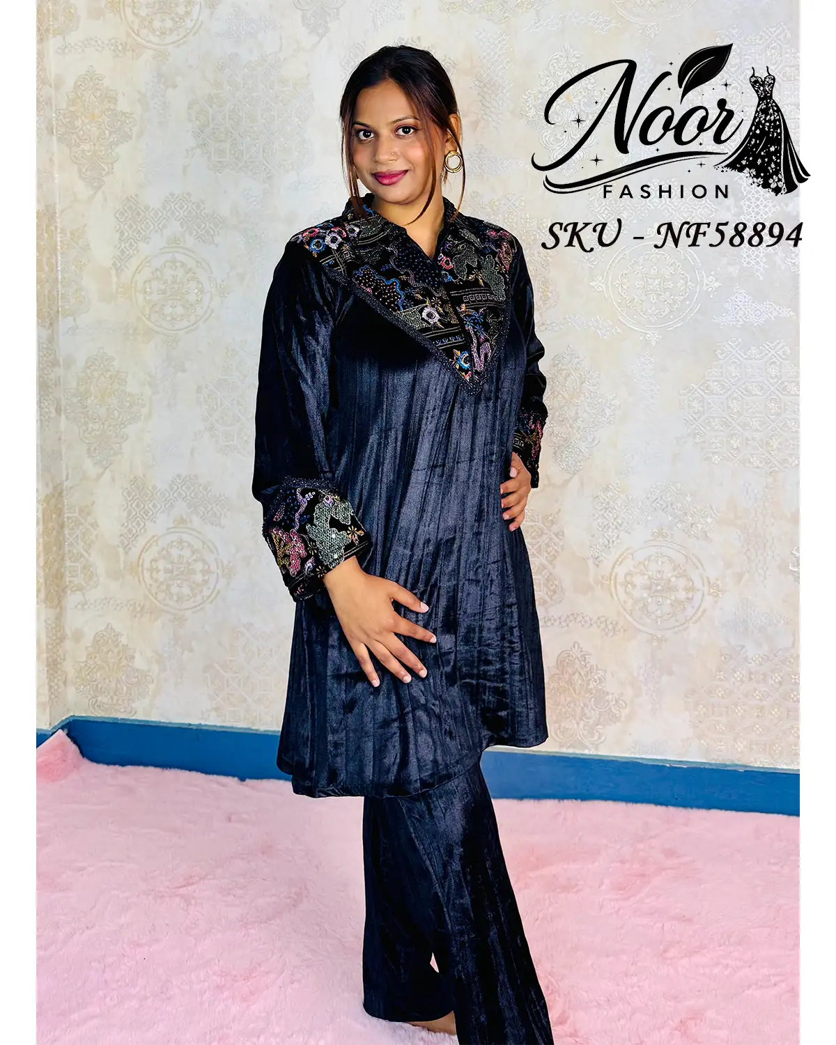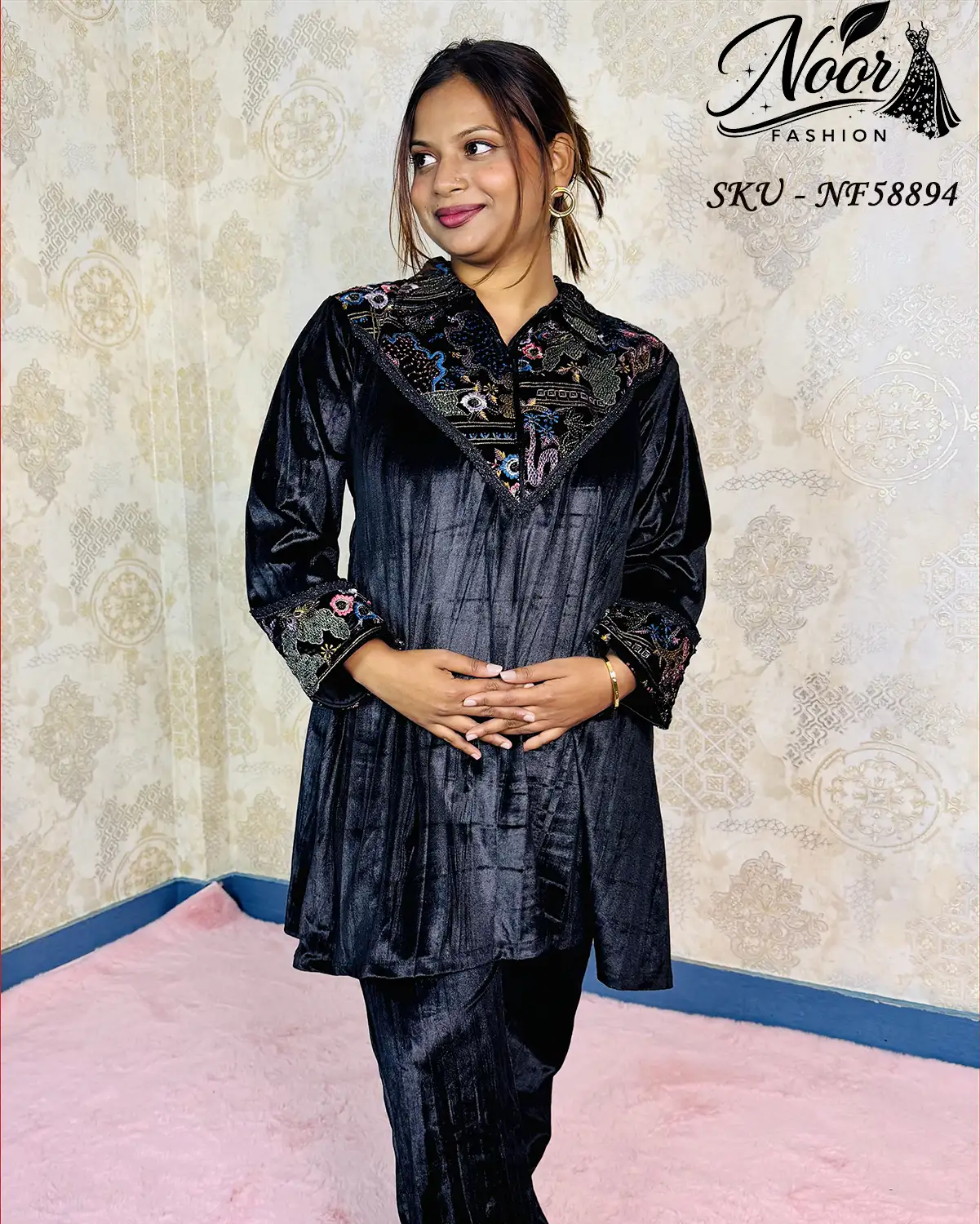 Elegant velvet co-ord set featuring a stylish collar and intricate Kashmiri embroidery. Perfect for winter festive wear with a rich and premium look.