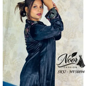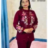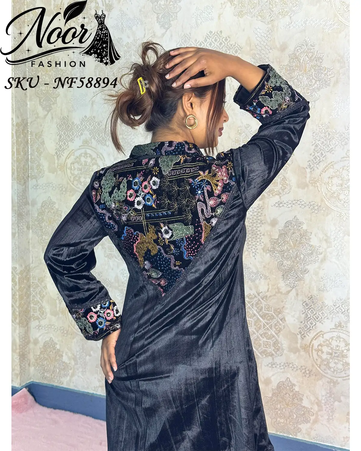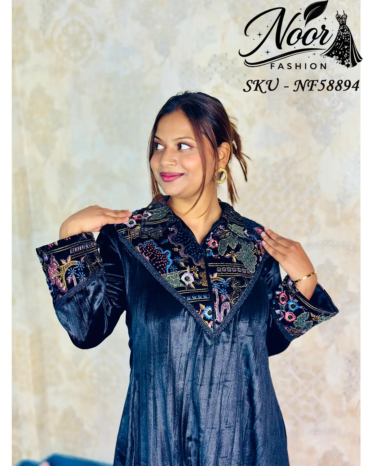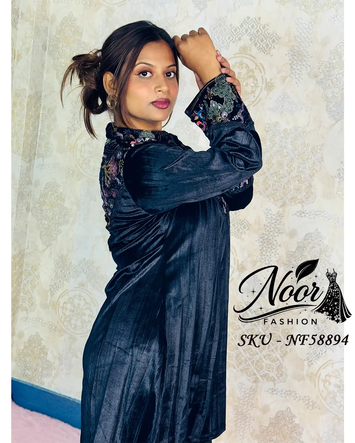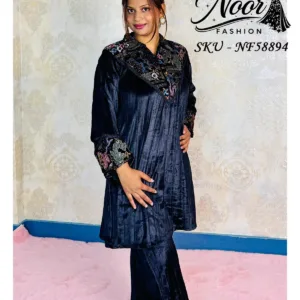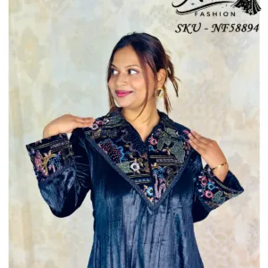 This velvet co-ord set with collar showcases beautiful Kashmiri embroidery that adds a refined ethnic touch to a modern silhouette. Crafted from soft velvet fabric, the outfit offers warmth, comfort, and a luxurious finish. The structured collar design enhances the overall elegance, making it suitable for festive occasions, parties, and special gatherings during the winter season.