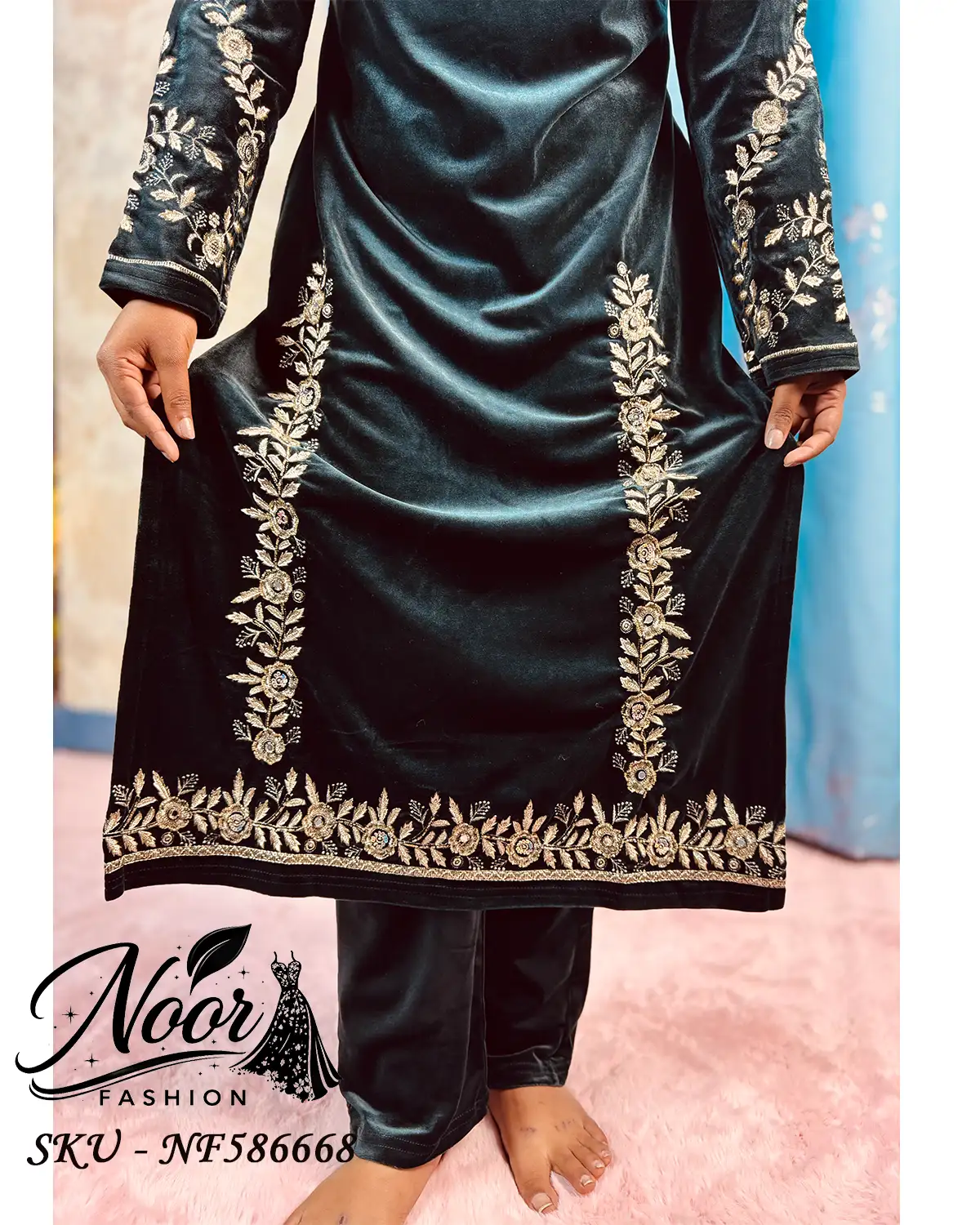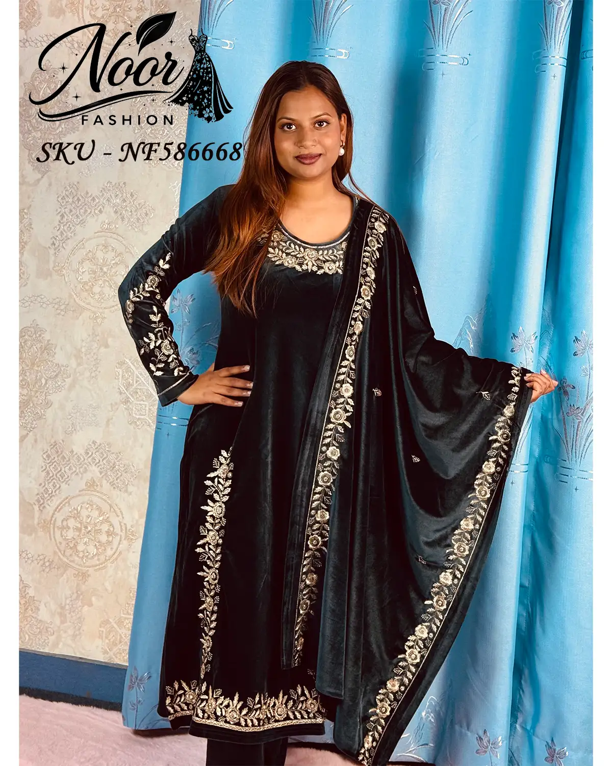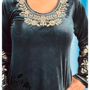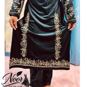 Luxurious black velvet 3-piece suit designed for formal warmth and elegance, featuring rich zari and sequin embroidery with a majestic look.