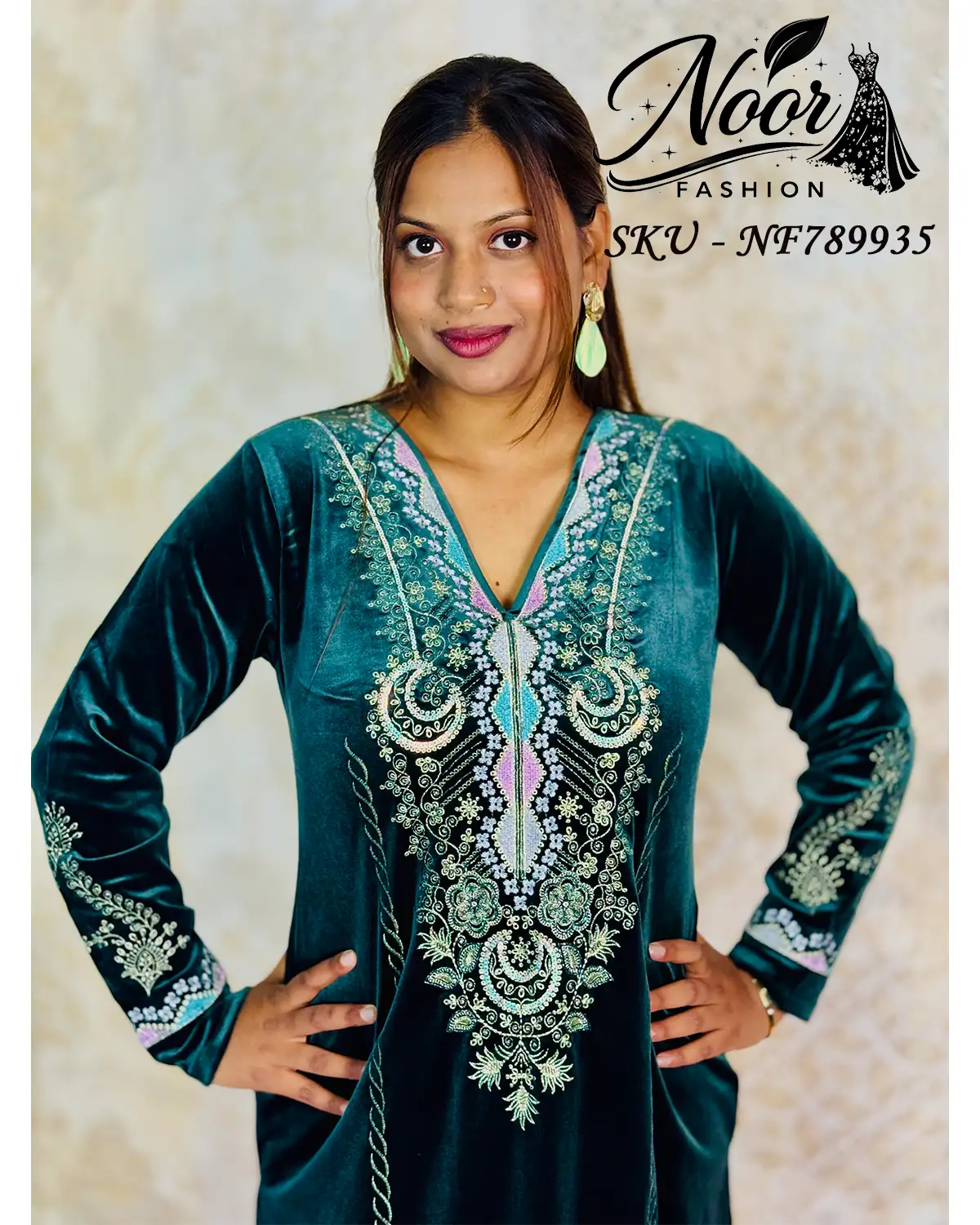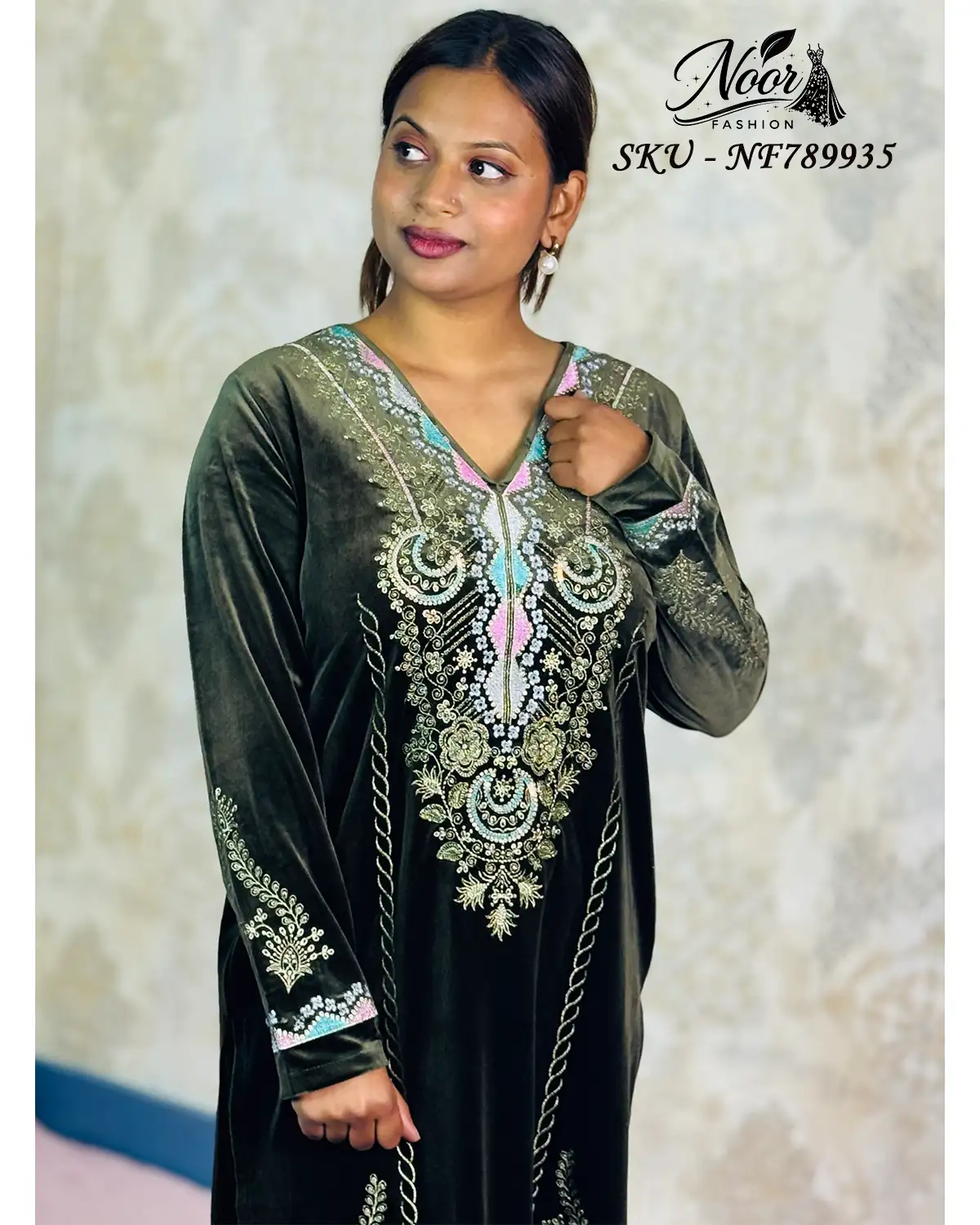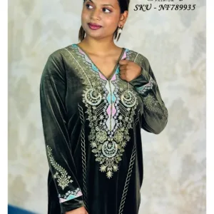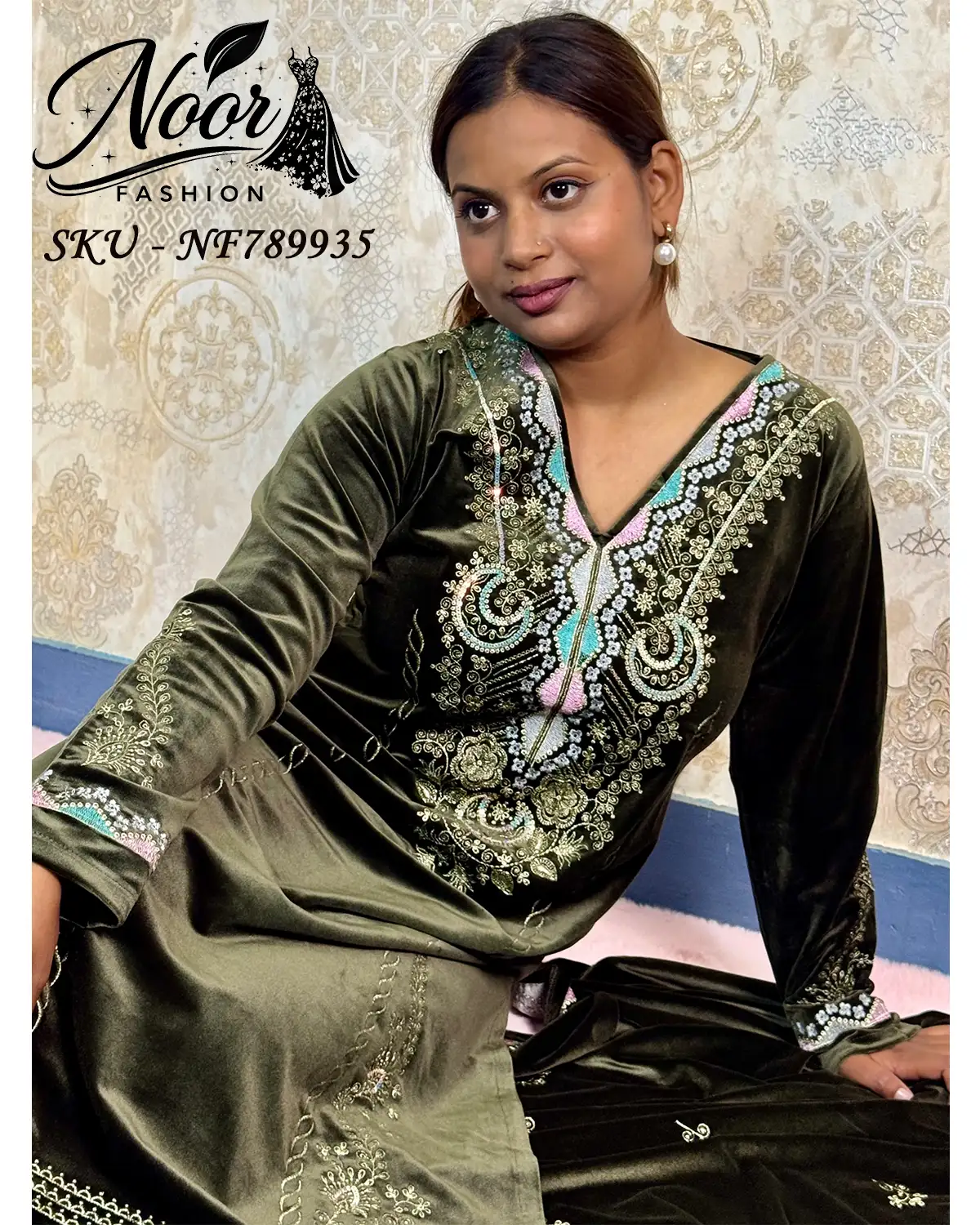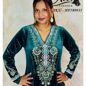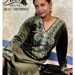 Luxurious velvet 3-piece suit designed for formal warmth and elegance, featuring rich zari and sequin embroidery with a majestic look.